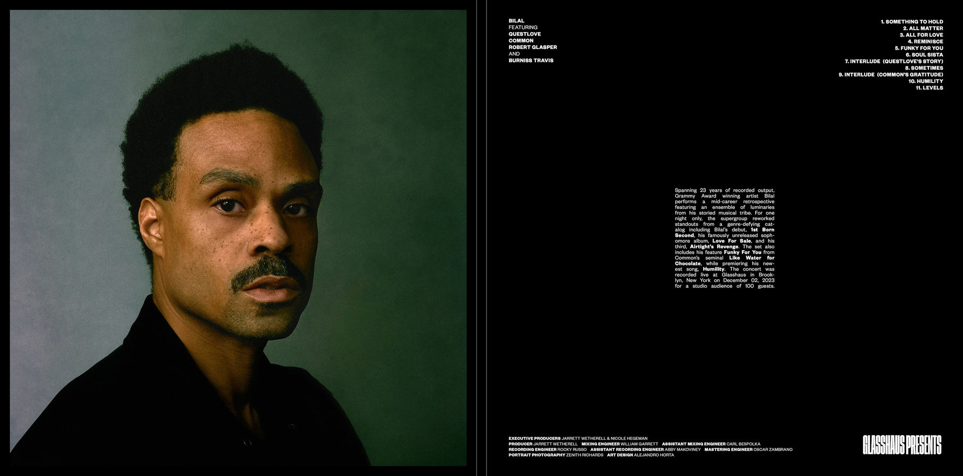 Spanning 23 years of recorded output, Grammy Award winning artist Bilal performed a mid-career retrospective featuring an ensemble of luminaries from his storied musical tribe. For one night only, the supergroup re-worked standouts from a genre-defying catalog including Bilal’s debut, 1st Born Second, his famously unreleased sophomore album, Love For Sale, Airtight’s Revenge, Common’s seminal Like Water for Chocolate, as well as premiering Bilal’s newest song, Humility. The concert was recorded, filmed and livestreamed from Glasshaus in Brooklyn, New York on December 02, 2023 for a studio audience of 100 guests.